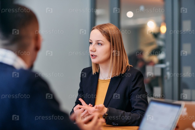 Бизнес-леди ведет дискуссию в современном офисе
