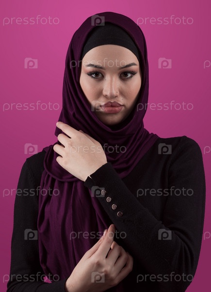 Современная мусульманка в стильной повседневной одежде хиджаб изолирована на розовом фоне. Разные люди моделируют концепцию моды хиджаб