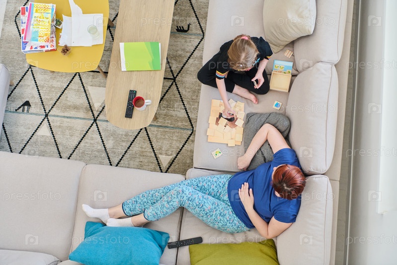 Вид сверху на мать и дочь, наслаждающихся веселой настольной игрой на диване дома