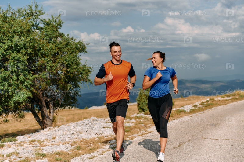 Пара в спортивной одежде бежит по живописной дороге во время утренней тренировки, наслаждаясь свежим воздухом и поддерживая здоровый образ жизни