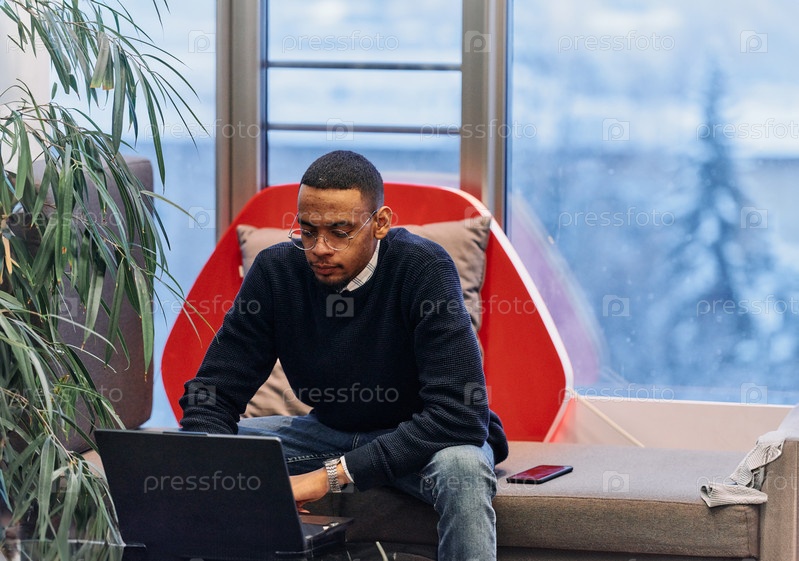Сверхурочная работа. Афроамериканец с закрытыми глазами отдыхает на работе за ноутбуком. Уставший программист-мужчина отдыхает из-за сверхурочной работы