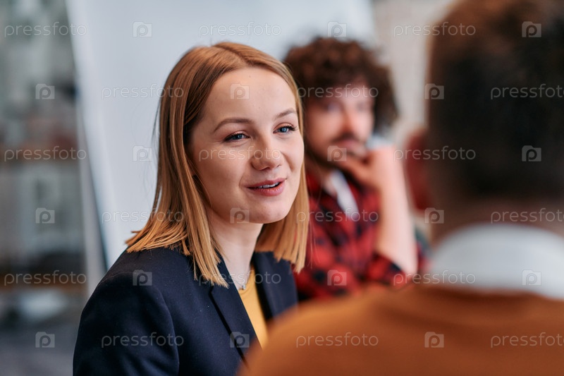 Бизнес-леди ведет дискуссию в современном офисе