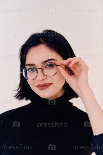 Улыбающаяся брюнетка в очках позирует на белом фоне