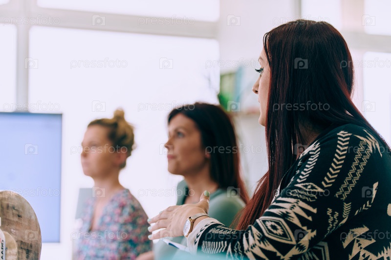 Женская бизнес-группа обсуждает новые темы и стратегии по улучшению клиентской деятельности