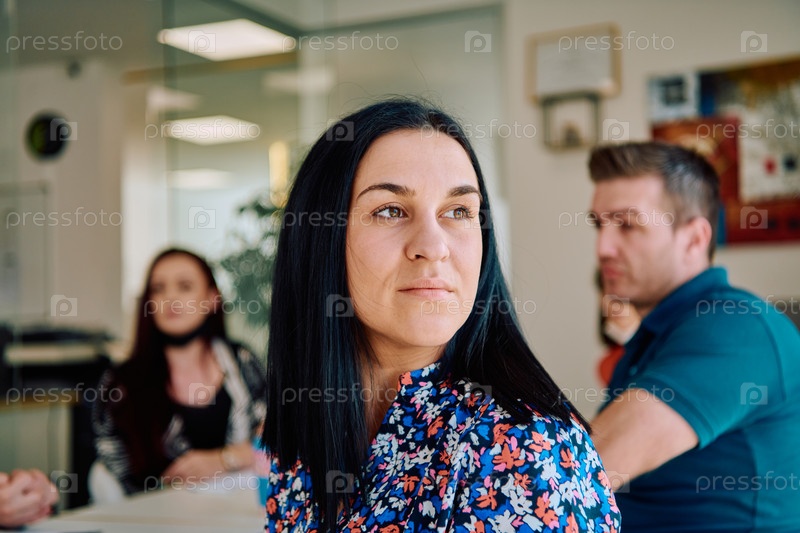 Профессиональная бизнес-леди проводит интересную встречу с коллегами: портрет