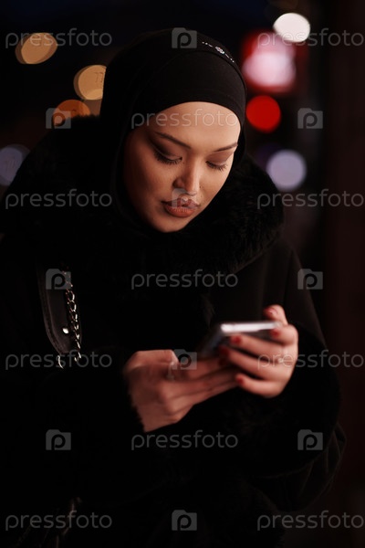 Европейская мусульманка в хиджабе, бизнес-леди, проверяет свой телефон на городской улице ночью