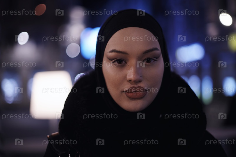 Мусульманка идет по городской улице холодной зимней ночью в хиджабе