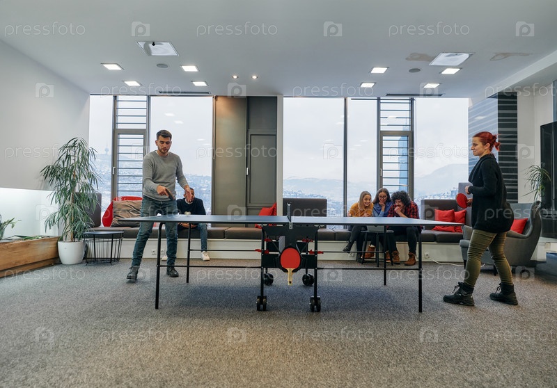 Коллеги по бизнесу отдыхают от работы, чтобы поиграть в настольный теннис, способствуя командной работе и товариществу на рабочем месте