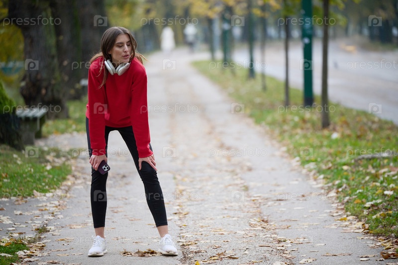 Спортивная молодая женщина делает вдох и расслабляется после пробежки и растяжки. Тренировка женщины и упражнения для тренировки на улице