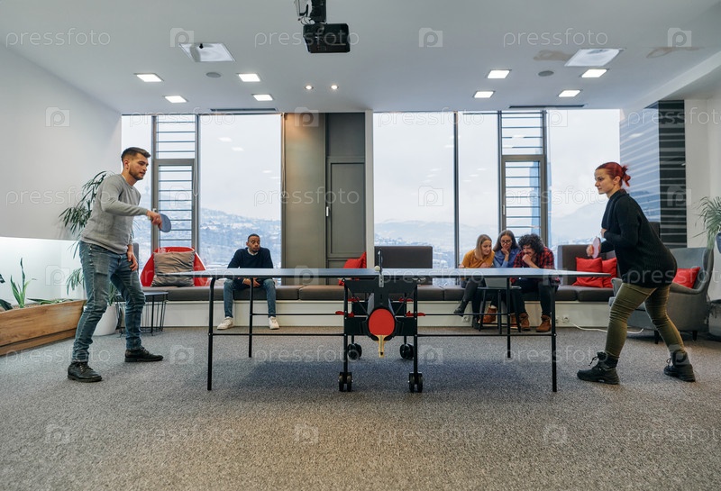 Коллеги по бизнесу отдыхают от работы, чтобы поиграть в настольный теннис, способствуя командной работе и товариществу на рабочем месте