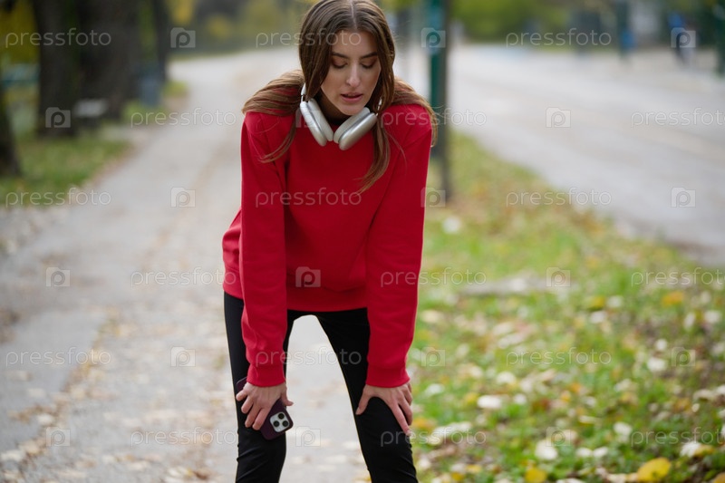 Спортивная молодая женщина делает вдох и расслабляется после пробежки и растяжки. Тренировка женщины и упражнения для тренировки на улице
