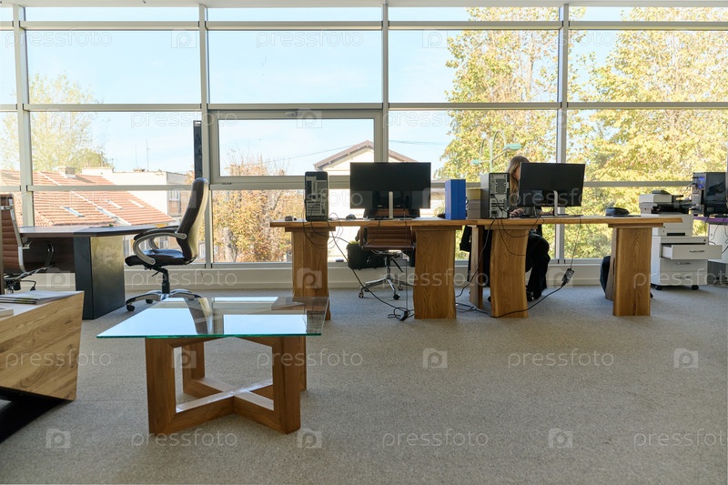 Современный интерьер офиса с деревянной мебелью, столом для переговоров и компьютерами