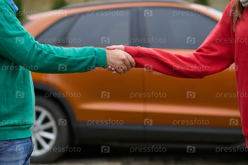 Рукопожатие при получении ключей от машины, продавец или продавец автомобилей и клиент в автосалоне пожимают друг другу руки при получении ключей от машины