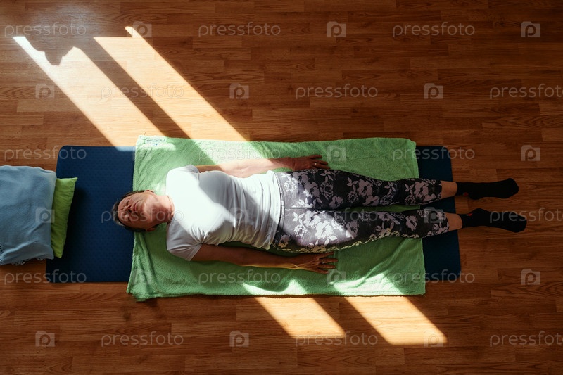 Пожилая женщина практикует растяжку и медитацию на полу, уделяя особое внимание правильному выравниванию и расслаблению