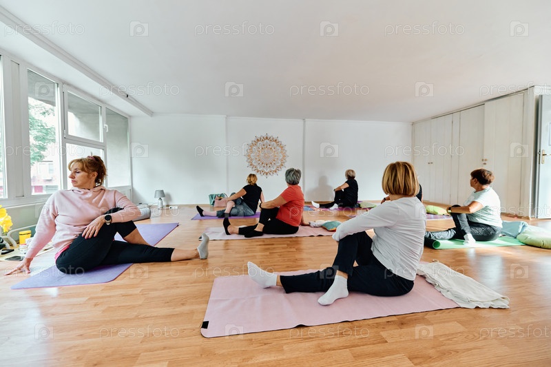 Группа пожилых женщин занимается различными упражнениями йоги, включая растяжку шеи, спины и ног, под руководством тренера в залитом солнцем месте, способствуя благополучию и гармонии