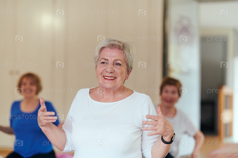 Группа пожилых женщин занимается различными упражнениями йоги, включая растяжку шеи, спины и ног, под руководством тренера в залитом солнцем месте, способствуя благополучию и гармонии