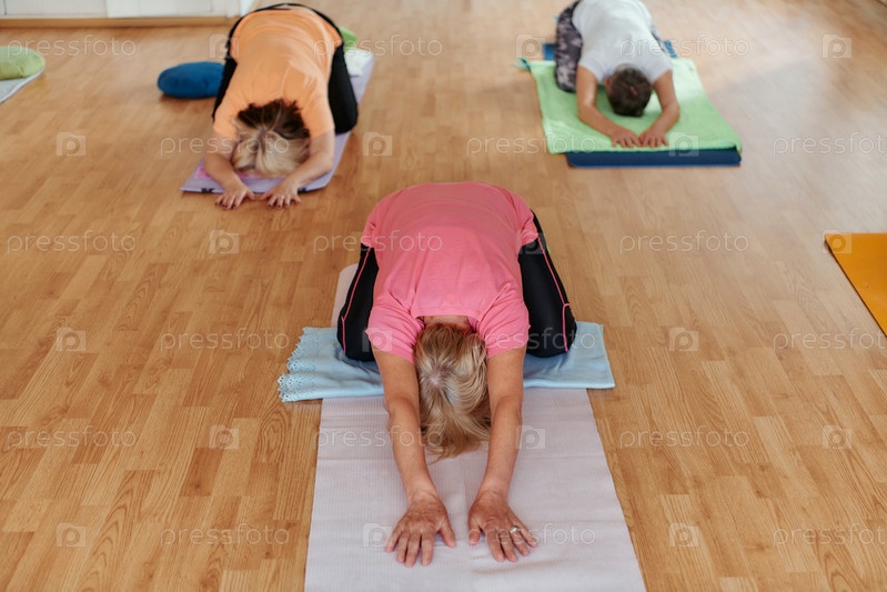 Женщины старшего возраста занимаются оздоровлением: йогой и растяжкой в залитом солнцем пространстве