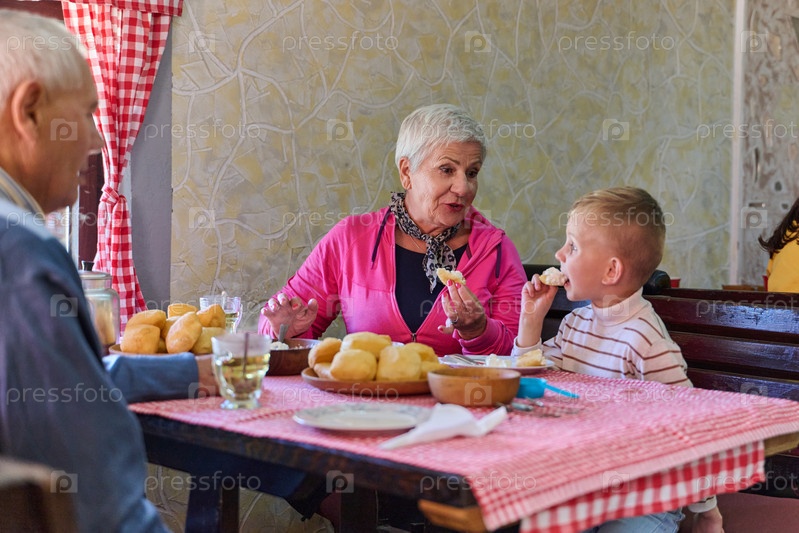 Пожилая пара разделяет душевную трапезу со своим внуком, создавая заветные воспоминания и наслаждаясь простыми радостями семейного общения в тихой сельской местности