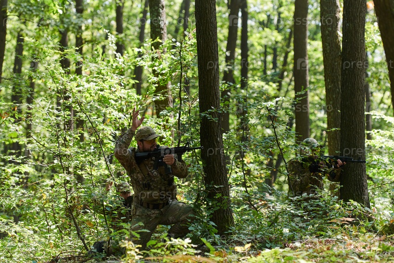 Элитный солдат, замаскированный и скрытно перемещающийся по опасной лесной местности, выполняет секретную миссию в уединенном лесном районе