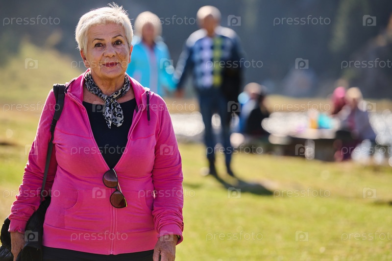Пожилая женщина обретает спокойствие и благополучие во время прогулки на природе, демонстрируя красоту активного и здорового образа жизни в ее золотые годы