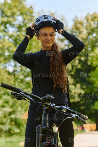 В лучезарных объятиях солнечного дня радостная девушка, облаченная в профессиональную велосипедную экипировку, находит чистое блаженство и жизненную силу, катаясь по парку на своем велосипеде, а ее заразительный смех отражает беззаботную гармонию момента