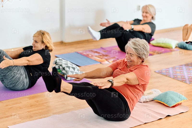 Группа пожилых женщин занимается различными упражнениями йоги, включая растяжку шеи, спины и ног, под руководством тренера в залитом солнцем месте, способствуя благополучию и гармонии