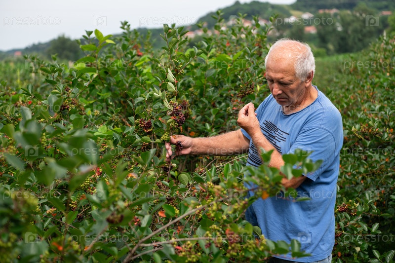 Старший фермер тщательно осматривает свою черничную ферму, чтобы убедиться в качестве и прогрессе