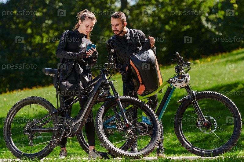 Милая парочка, вооруженная велосипедами и поглощенная планированием своего путешествия, проверяет свои мобильные телефоны и часы, планируя живописные маршруты в парке, органично сочетая технологии и приключения на свежем воздухе для восхитительного опыта