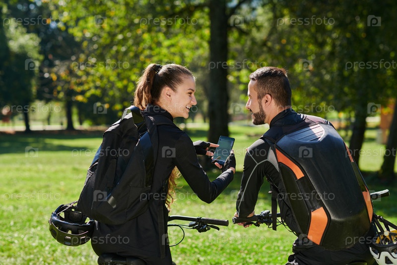Милая парочка, вооруженная велосипедами и поглощенная планированием своего путешествия, проверяет свои мобильные телефоны и часы, планируя живописные маршруты в парке, органично сочетая технологии и приключения на свежем воздухе для восхитительного опыта