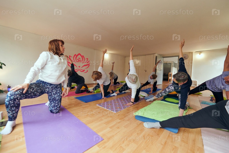 Группа пожилых женщин занимается различными упражнениями йоги, включая растяжку шеи, спины и ног, под руководством тренера в залитом солнцем месте, способствуя благополучию и гармонии