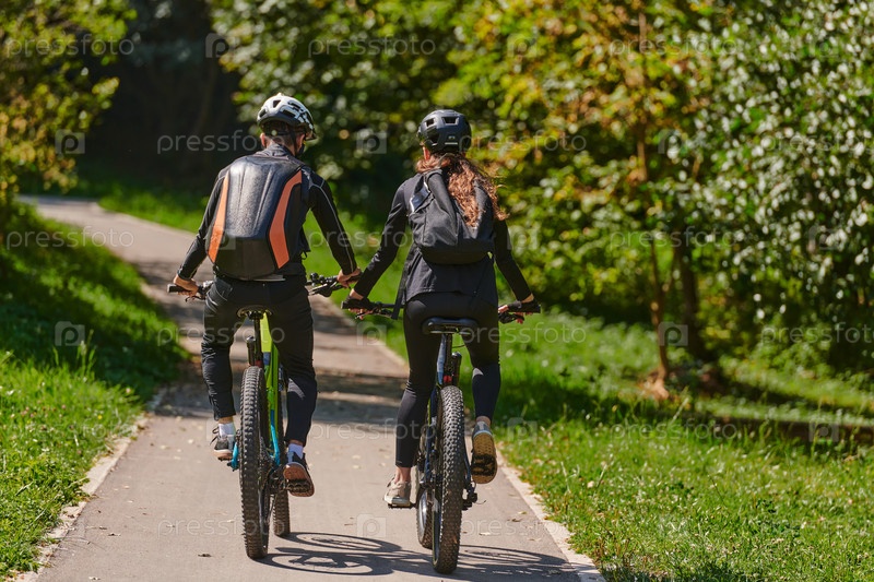 Счастливая пара, одетая в профессиональную велосипедную экипировку, наслаждается романтической велопрогулкой по парку, окруженному современными природными достопримечательностями, излучая любовь и счастье