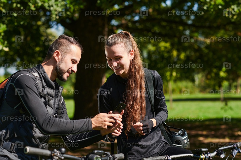 Милая парочка, вооруженная велосипедами и поглощенная планированием своего путешествия, проверяет свои мобильные телефоны и часы, планируя живописные маршруты в парке, органично сочетая технологии и приключения на свежем воздухе для восхитительного опыта