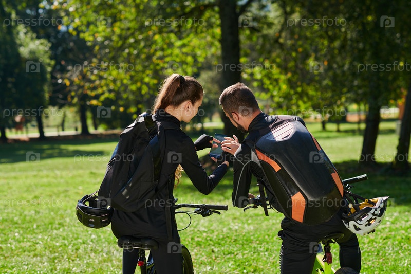 Милая парочка, вооруженная велосипедами и поглощенная планированием своего путешествия, проверяет свои мобильные телефоны и часы, планируя живописные маршруты в парке, органично сочетая технологии и приключения на свежем воздухе для восхитительного опыта