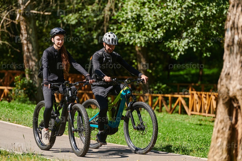 Счастливая пара, одетая в профессиональную велосипедную экипировку, наслаждается романтической велопрогулкой по парку, окруженному современными природными достопримечательностями, излучая любовь и счастье