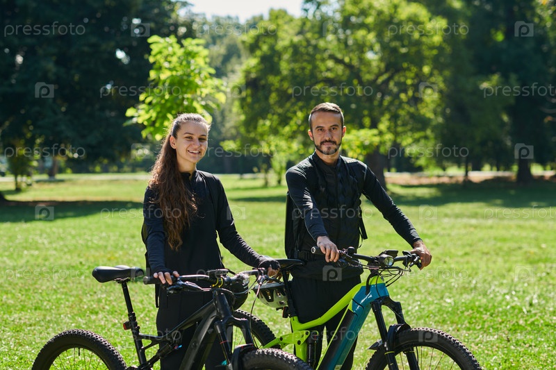 Счастливая пара, одетая в профессиональную велосипедную экипировку, наслаждается романтической велопрогулкой по парку, окруженному современными природными достопримечательностями, излучая любовь и счастье