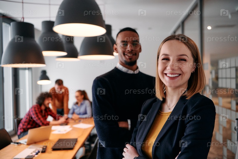 Динамичный лидерский дуэт: светловолосый директор и молодой афроамериканский предприниматель в офисной обстановке