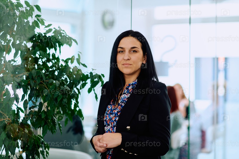 Портрет уверенной в себе деловой женщины со скрещенными руками в офисной обстановке