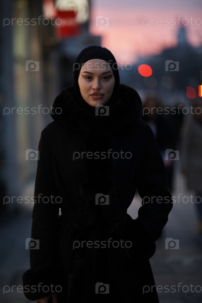 Мусульманка идет по городской улице холодной зимней ночью в хиджабе
