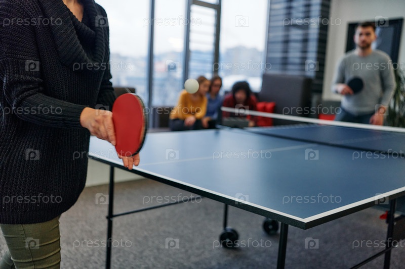 Коллеги по бизнесу отдыхают от работы, чтобы поиграть в настольный теннис, способствуя командной работе и товариществу на рабочем месте
