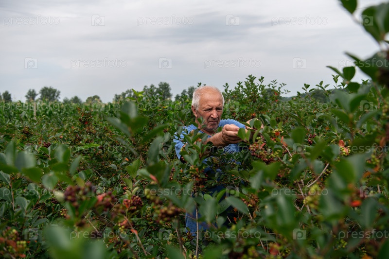Старший фермер тщательно осматривает свою черничную ферму, чтобы убедиться в качестве и прогрессе