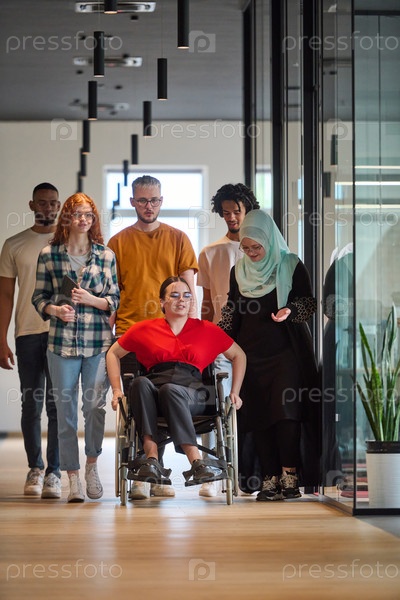 Группа молодых бизнесменов разного пола идет по коридору в застекленном офисе современного стартапа, среди них — человек в инвалидной коляске и женщина в хиджабе