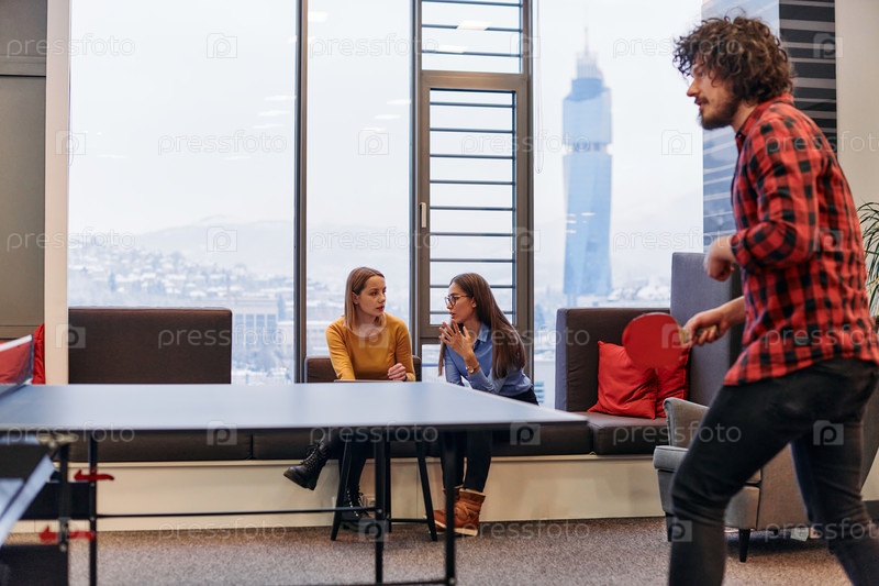 Коллеги по бизнесу отдыхают от работы, чтобы поиграть в настольный теннис, способствуя командной работе и товариществу на рабочем месте