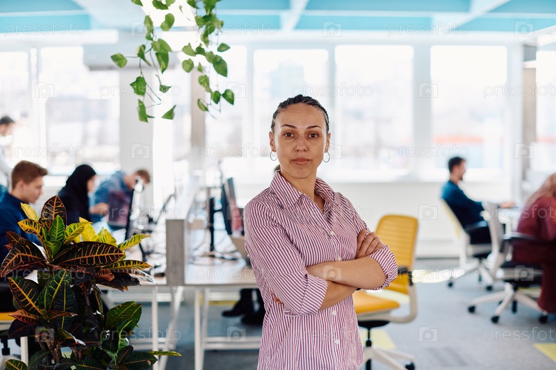 Портрет молодой улыбающейся деловой женщины в креативном открытом пространстве коворкинга стартап-офиса. Успешная бизнес-леди стоит в офисе с копирайтом. Коллеги, работающие на заднем плане