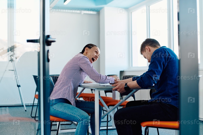 В современном офисе стартапа бизнесмен и его коллеги по бизнесу устраивают символический поединок по армрестлингу, отражающий командную работу, конкуренцию и инновации в их динамичном рабочем пространстве