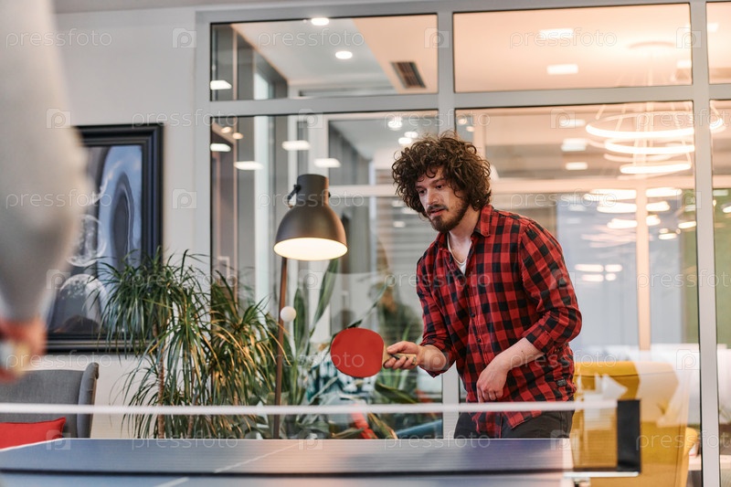 Коллеги по бизнесу отдыхают от работы, чтобы поиграть в настольный теннис, способствуя командной работе и товариществу на рабочем месте