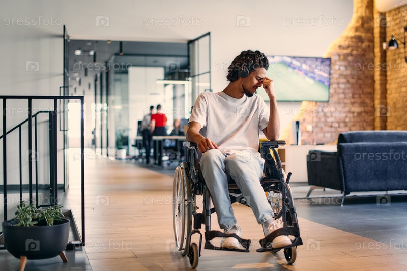 Афроамериканский подросток в инвалидной коляске грустно сидит на фоне оживленной обстановки современного офиса стартапа в окружении своих коллег по бизнесу