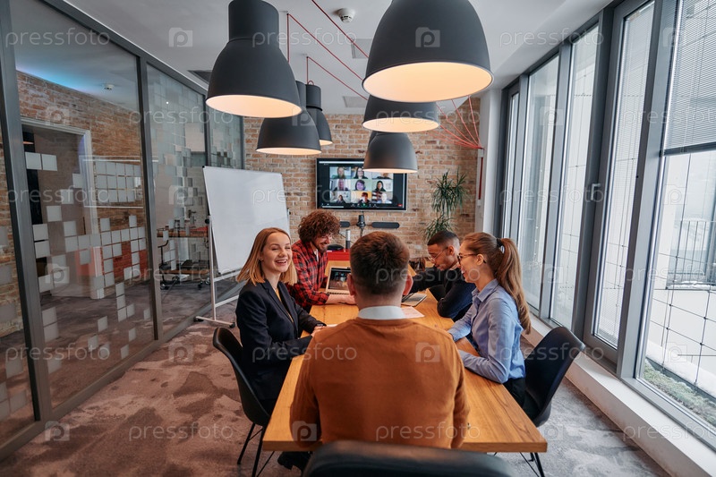 В яркой атмосфере современного офиса стартапа разнообразная команда профессионалов в сфере бизнеса участвует в обсуждениях различных проектов и разрабатывает новые бизнес-стратегии, олицетворяя креативность и инновации в предпринимательской среде