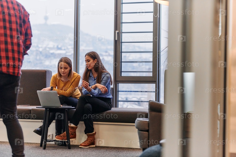 Коллеги по бизнесу проверяют работу на ноутбуке во время перерыва