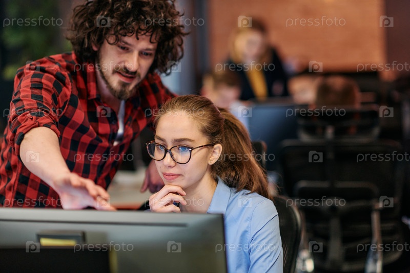 Коллеги по бизнесу, мужчина и женщина, обсуждают бизнес-стратегии, внимательно глядя на монитор компьютера, олицетворяя сотрудничество и инновации