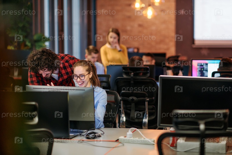 Молодая европейская бизнес-команда работает за компьютером в современном офисе
